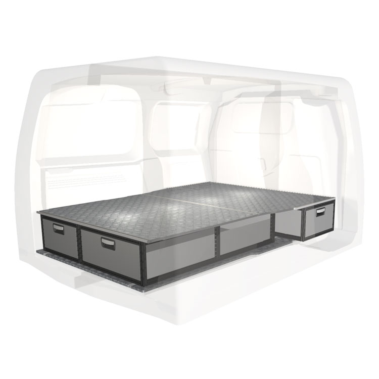 The kit is designed to be fitted on top of a Modul-Floor, utilizing the floor rails for a non-intrusive installation. The double floor is equipped with rails for easy installation of vehicle racking, and edging strips for a nice finish.