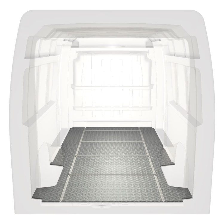 Leichte und robuste Fahrzeugböden mit Querschienen für einen Citroën Jumper / Peugeot Boxer / Fiat Ducato werden mit einem rutschfesten Trittblech aus Aluminium und Schienen (längs und quer) für eine schnelle und sichere Montage von Regalsystemen und anderem Zubehör geliefert.