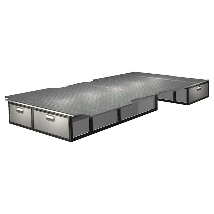 The kit is designed to be fitted on top of a wooden floor. The double floor is equipped with rails for easy installation of vehicle racking, and edging strips for a nice finish.