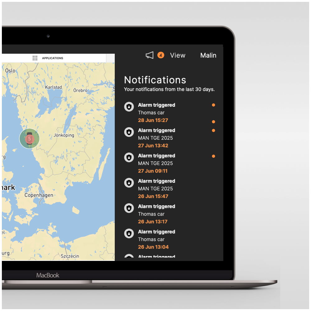 In the Customer Portal, you receive notifications whenever an alarm is triggered and can easily see on the map which vehicle is alarming. The system gives you full control and overview of all events, enhancing security and enabling quick response when needed.