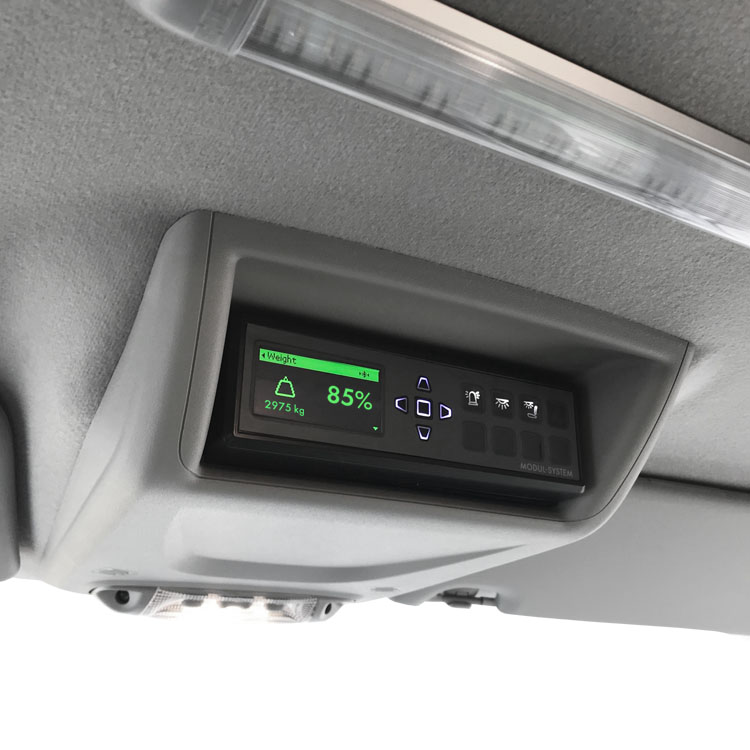 Display-Schalttafel mit OLED-Bildschirm, die in den Kabinenbereich des Fahrzeugs passt. Mit hintergrundbeleuchteten Schaltern kann der Fahrer leicht erkennen, welches Zubehör eingeschaltet ist.
