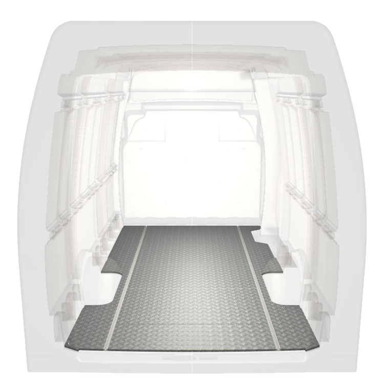 Leichte und robuste Standard-Fahrzeugböden für einen Iveco Daily werden mit einem rutschfesten Trittblech aus Aluminium und Schienen (längs) für eine schnelle und sichere Montage von Regalsystemen und anderem Zubehör geliefert.