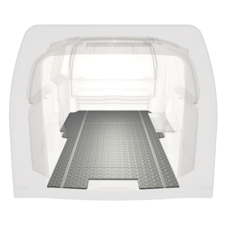 Leichte und robuste Standard-Fahrzeugböden für einen Citroën Jumpy / Peugeot Expert / Toyota ProAce werden mit einem rutschfesten Trittblech aus Aluminium und Schienen (längs) für eine schnelle und sichere Montage von Regalsystemen und anderem Zubehör geliefert.