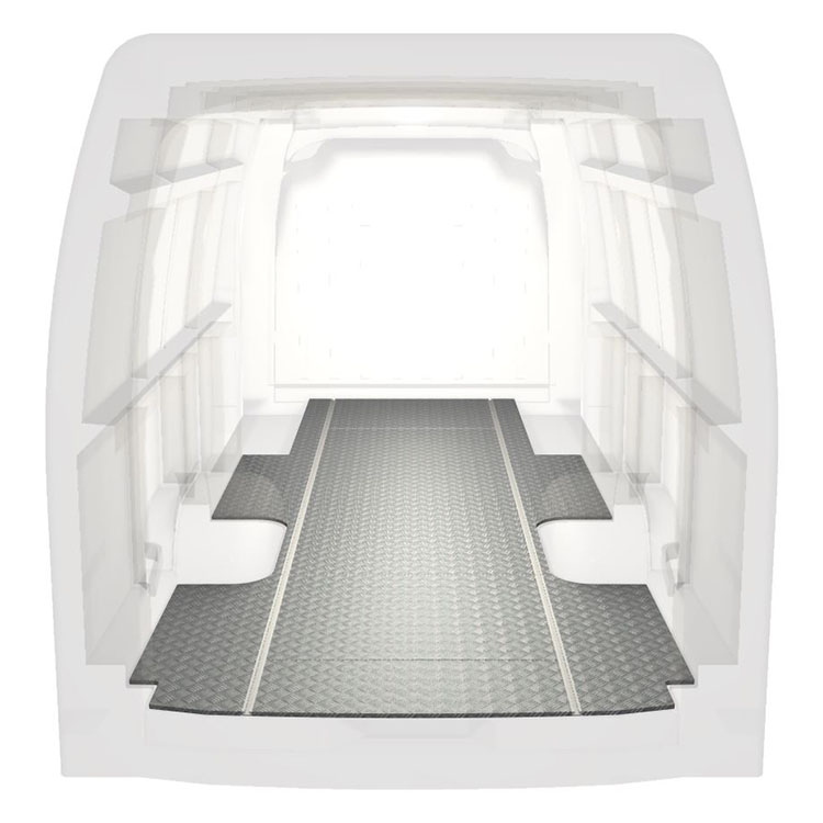 Leichte und robuste Standard-Fahrzeugböden für einen Renault Master / Opel Movano / Nissan NV400 werden mit einem rutschfesten Trittblech aus Aluminium und Schienen (längs) für eine schnelle und sichere Montage von Regalsystemen und anderem Zubehör geliefert.
