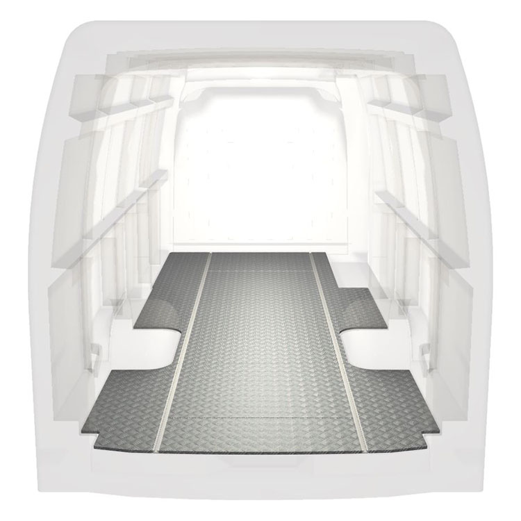 Leichte und robuste Standard-Fahrzeugböden für einen Renault Master / Opel Movano / Nissan NV400 werden mit einem rutschfesten Trittblech aus Aluminium und Schienen (längs) für eine schnelle und sichere Montage von Regalsystemen und anderem Zubehör geliefert.