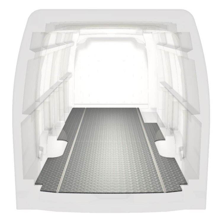 Leichte und robuste, extra lange Böden für einen Renault Master / Opel Movano / Nissan NV400 werden mit einem rutschfesten Trittblech aus Aluminium und Schienen (längs) für eine schnelle und sichere Montage von Regalsystemen und anderem Zubehör geliefert.