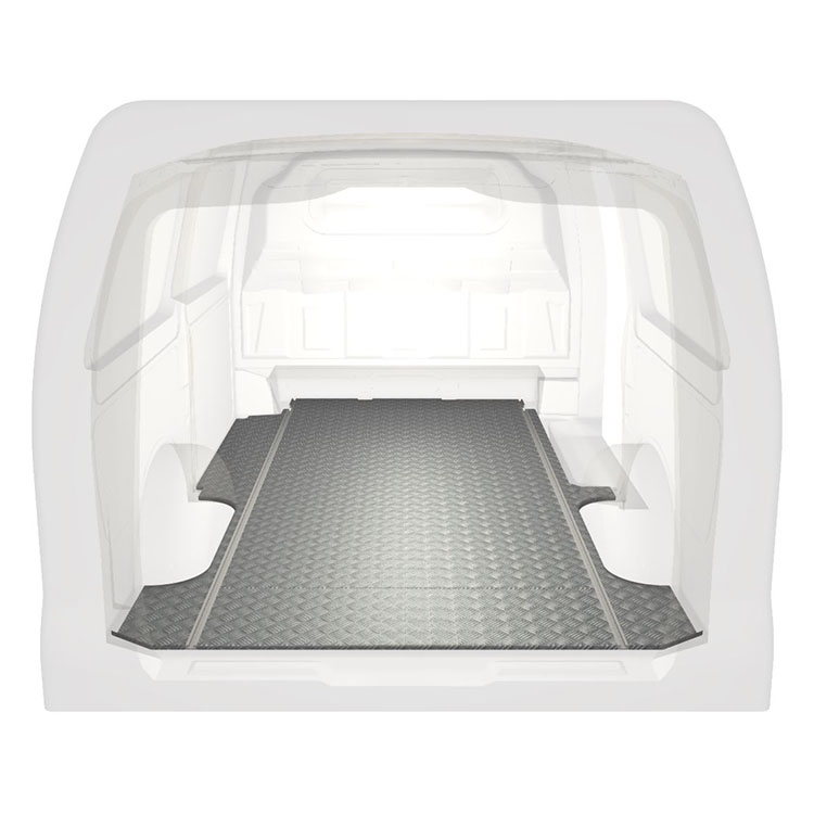 Leichte und robuste, extra lange Böden für einen Mercedes Vito werden mit einem rutschfesten Trittblech aus Aluminium und Schienen (längs) für eine schnelle und sichere Montage von Regalsystemen und anderem Zubehör geliefert.