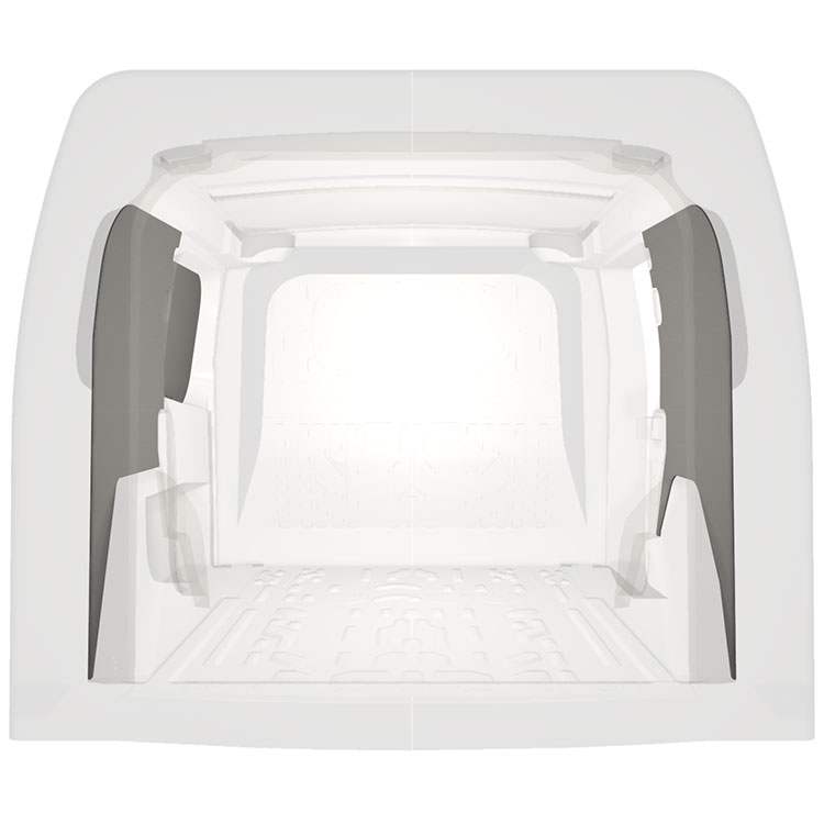 Leichte Vollverkleidung für die Innenwände eines Opel Combo / Fiat Doblò mit Seitentür rechts.Die Verkleidungen schaffen ein helles und angenehmes Arbeitsumfeld und sind leicht zu reinigen.