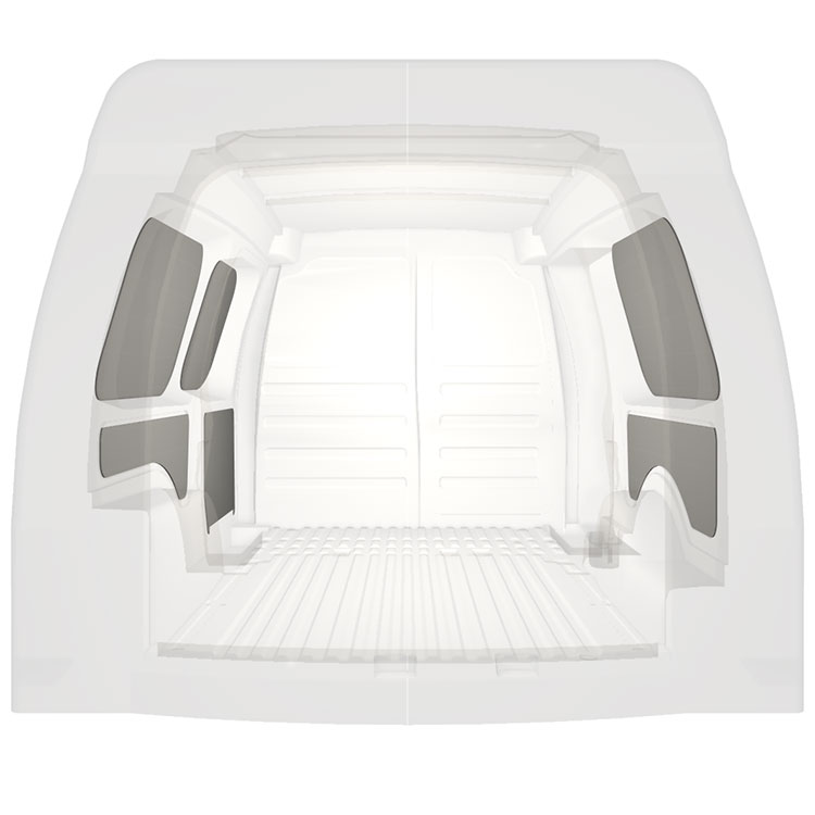 Leichte Innenverkleidung für die Innenwände eines Volkswagen Caddy Maxi mit Seitentür rechts. Die Verkleidungen schaffen ein helles und angenehmes Arbeitsumfeld und sind leicht zu reinigen.