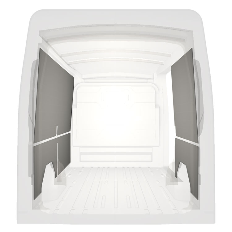 Leichte Innenverkleidung für die Innenwände eines Ford Transit mit Seitentür rechts. Die Verkleidungen schaffen ein helles und angenehmes Arbeitsumfeld und sind leicht zu reinigen.