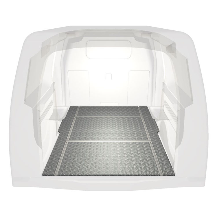 Leichte und robuste Fahrzeugböden mit Querschienen für einen Berlingo/Partner/Combo 19- werden mit einem rutschfesten Trittblech aus Aluminium und Schienen (längs und quer) für eine schnelle und sichere Montage von Regalsystemen und anderem Zubehör geliefert.