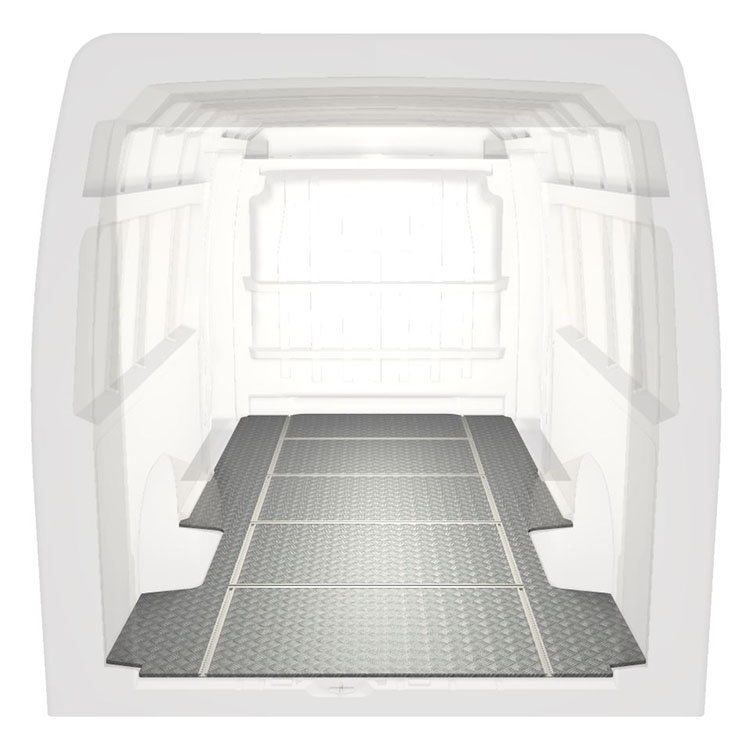 Leichte und robuste Fahrzeugböden mit Querschienen für einen Citroën Jumper / Peugeot Boxer / Fiat Ducato werden mit einem rutschfesten Trittblech aus Aluminium und Schienen (längs und quer) für eine schnelle und sichere Montage von Regalsystemen und anderem Zubehör geliefert.