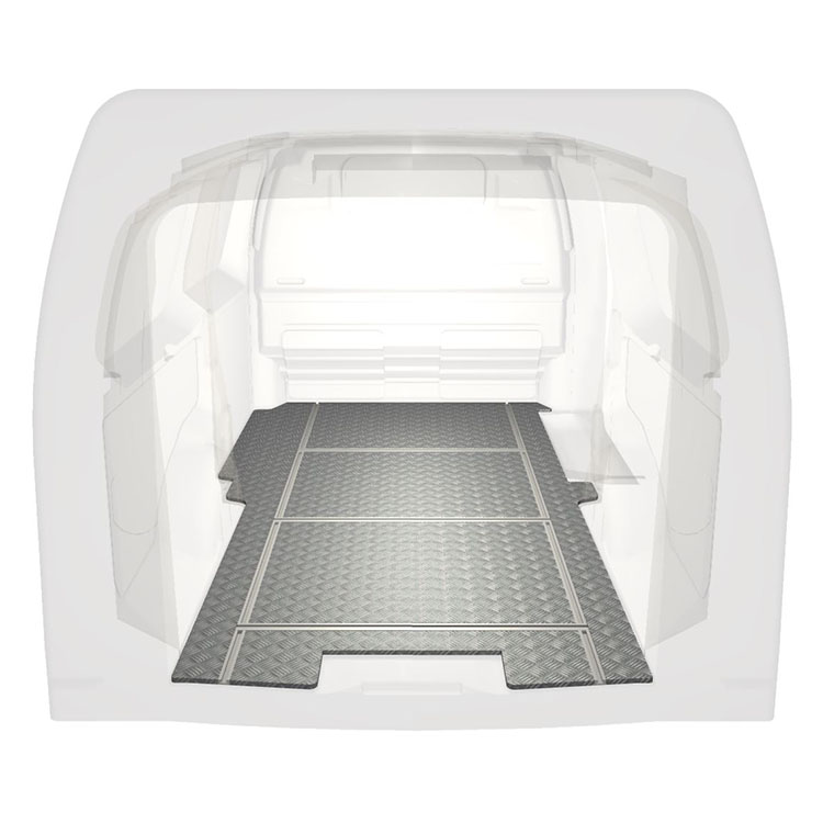 Leichte und robuste Fahrzeugböden mit Querschienen für einen Citroën Jumpy / Peugeot Expert / Toyota ProAce werden mit einem rutschfesten Trittblech aus Aluminium und Schienen (längs und quer) für eine schnelle und sichere Montage von Regalsystemen und anderem Zubehör geliefert.