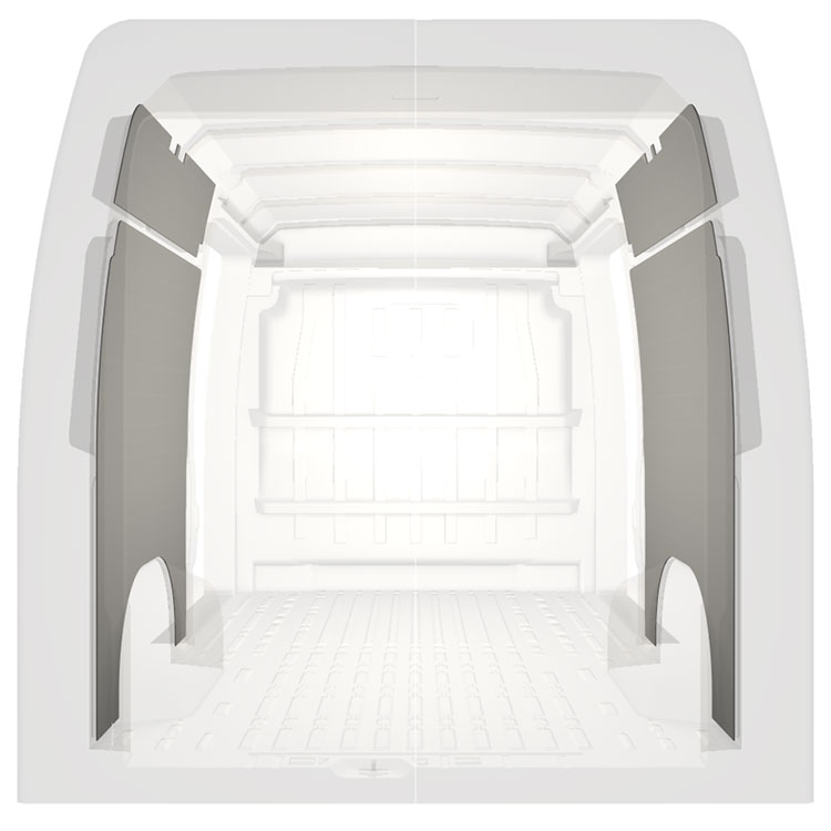 Leichte Vollverkleidung für die Innenwände eines Citroën Jumper / Peugeot Boxer / Fiat Ducato mit beidseitigen Seitentüren. Die Verkleidungen schaffen ein helles und angenehmes Arbeitsumfeld und sind leicht zu reinigen.