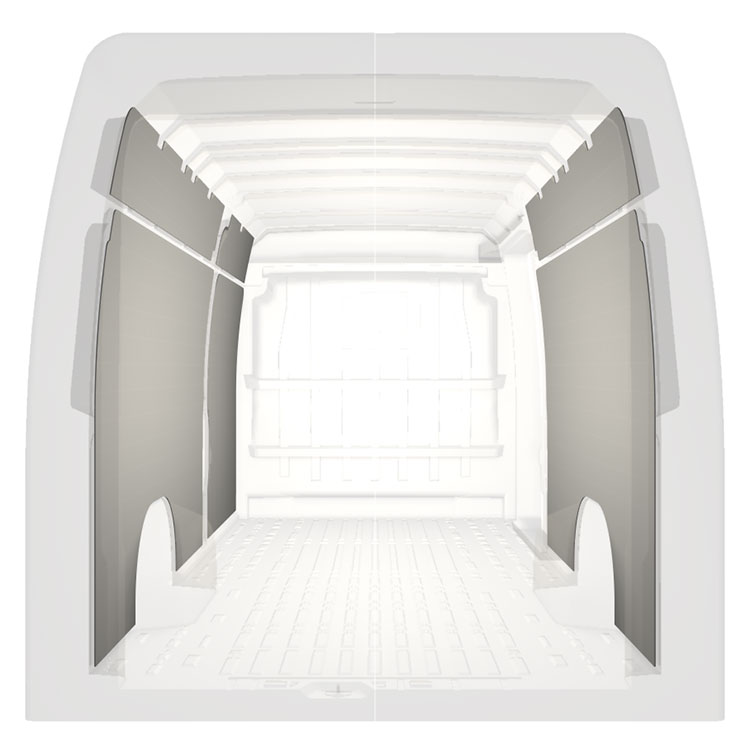 Leichte Vollverkleidung für die Innenwände eines Citroën Jumper / Peugeot Boxer / Fiat Ducato mit Seitentür rechts.Die Verkleidungen schaffen ein helles und angenehmes Arbeitsumfeld und sind leicht zu reinigen.