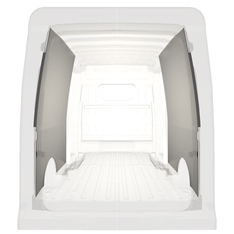 Leichte Vollverkleidung für die Innenwände eines Volkswagen Crafter / MAN TGE mit beidseitigen Seitentüren. Die Verkleidungen schaffen ein helles und angenehmes Arbeitsumfeld und sind leicht zu reinigen.