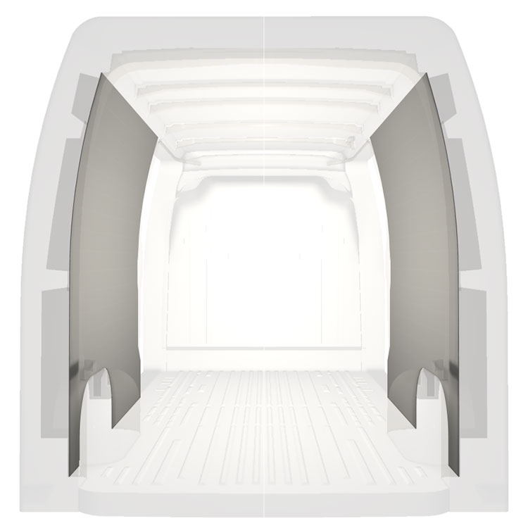 Leichte Vollverkleidung für die Innenwände eines Renault Master / Opel Movano / Nissan NV400 mit beidseitigen Seitentüren. Die Verkleidungen schaffen ein helles und angenehmes Arbeitsumfeld und sind leicht zu reinigen.