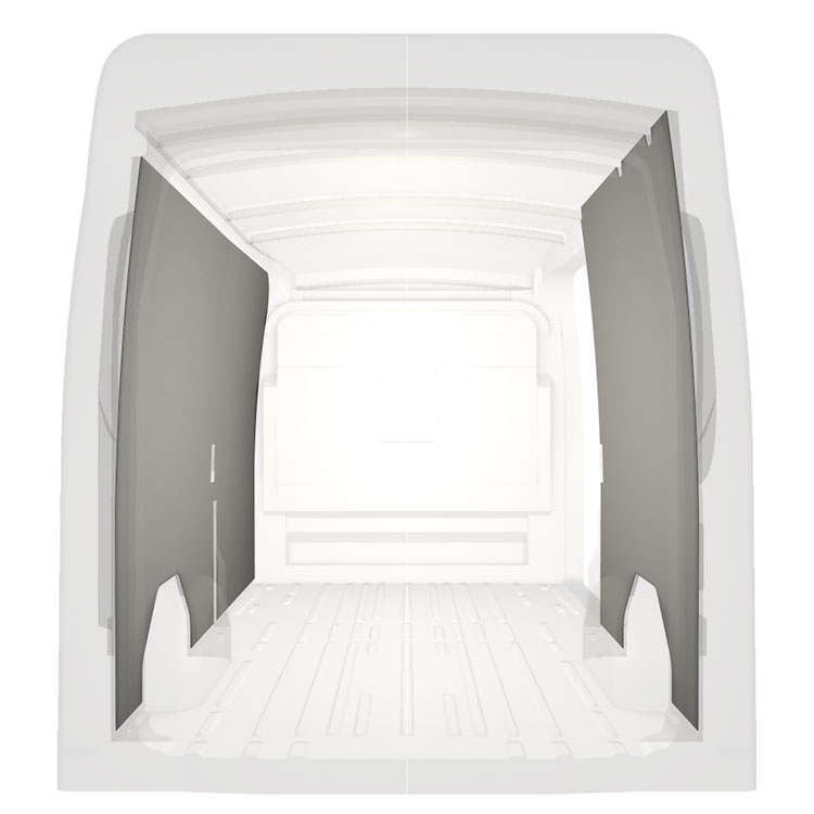 Leichte Vollverkleidung für die Innenwände eines Ford Transit mit Seitentür rechts.Die Verkleidungen schaffen ein helles und angenehmes Arbeitsumfeld und sind leicht zu reinigen.