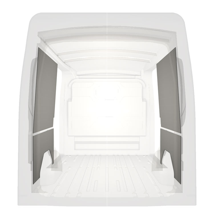 Leichte, zugeschnittene Verkleidung für die Innenwände eines Ford Transit mit beidseitigen Seitentüren. Die Verkleidungen schaffen ein helles und angenehmes Arbeitsumfeld und sind leicht zu reinigen.