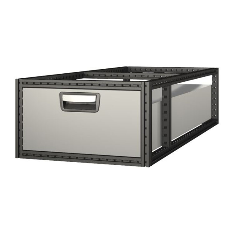 Die extralangen Schubladenmodule haben einen Rahmen aus ultrahochfestem Stahl und Schubladen aus Aluminium. Die Schubladen sind serienmäßig mit Kugellagern ausgestattet. Die Mischung aus festen und flexiblen Lagern macht sie sowohl stabil als auch einfach zu bedienen.