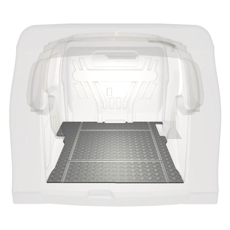 Leichte und robuste Fahrzeugböden mit Querschienen für einen Ford Transit Connect werden mit einem rutschfesten Trittblech aus Aluminium und Schienen (längs und quer) für eine schnelle und sichere Montage von Regalsystemen und anderem Zubehör geliefert.