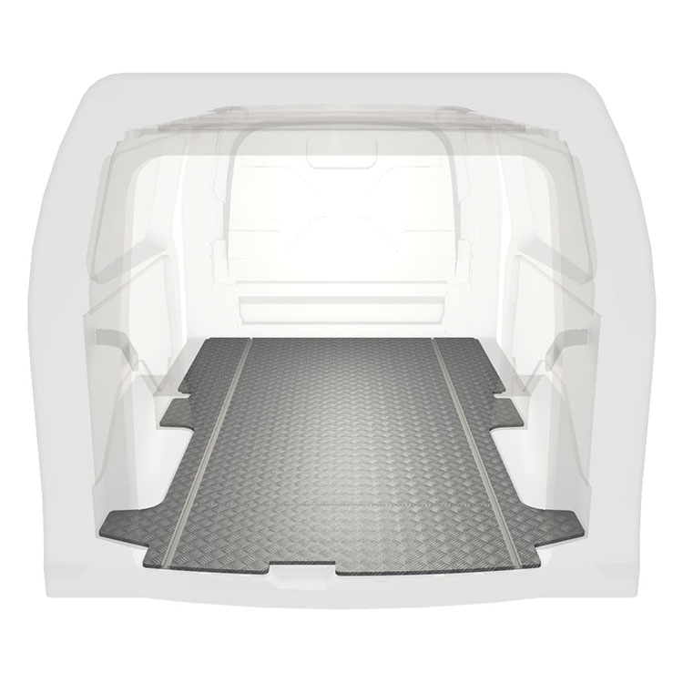 Leichte und robuste Standard-Fahrzeugböden für einen Ford Transit Custom werden mit einem rutschfesten Trittblech aus Aluminium und Schienen (längs) für eine schnelle und sichere Montage von Regalsystemen und anderem Zubehör geliefert.