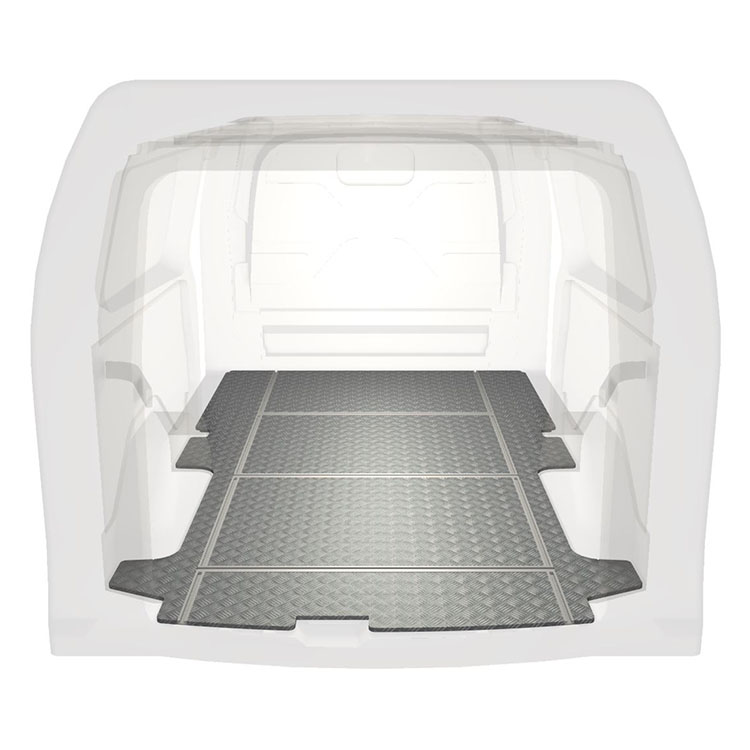 Leichte und robuste Fahrzeugböden mit Querschienen für einen Ford Transit Custom werden mit einem rutschfesten Trittblech aus Aluminium und Schienen (längs und quer) für eine schnelle und sichere Montage von Regalsystemen und anderem Zubehör geliefert.