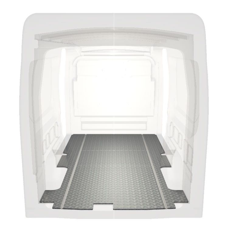 Leichte und robuste Standard-Fahrzeugböden für einen Ford Transit werden mit einem rutschfesten Trittblech aus Aluminium und Schienen (längs) für eine schnelle und sichere Montage von Regalsystemen und anderem Zubehör geliefert.