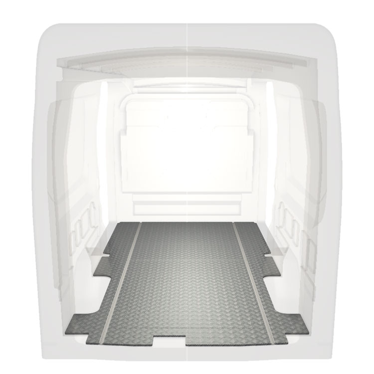 Leichte und robuste, extra lange Böden für einen Ford Transit werden mit einem rutschfesten Trittblech aus Aluminium und Schienen (längs) für eine schnelle und sichere Montage von Regalsystemen und anderem Zubehör geliefert.