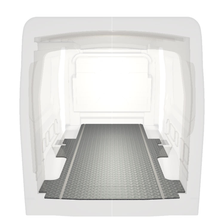 Leichte und robuste, extra lange Böden für einen Ford Transit werden mit einem rutschfesten Trittblech aus Aluminium und Schienen (längs) für eine schnelle und sichere Montage von Regalsystemen und anderem Zubehör geliefert.
