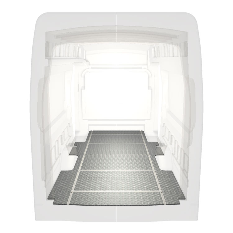 Leichte und robuste Fahrzeugböden mit Querschienen für einen Ford Transit werden mit einem rutschfesten Trittblech aus Aluminium und Schienen (längs und quer) für eine schnelle und sichere Montage von Regalsystemen und anderem Zubehör geliefert.