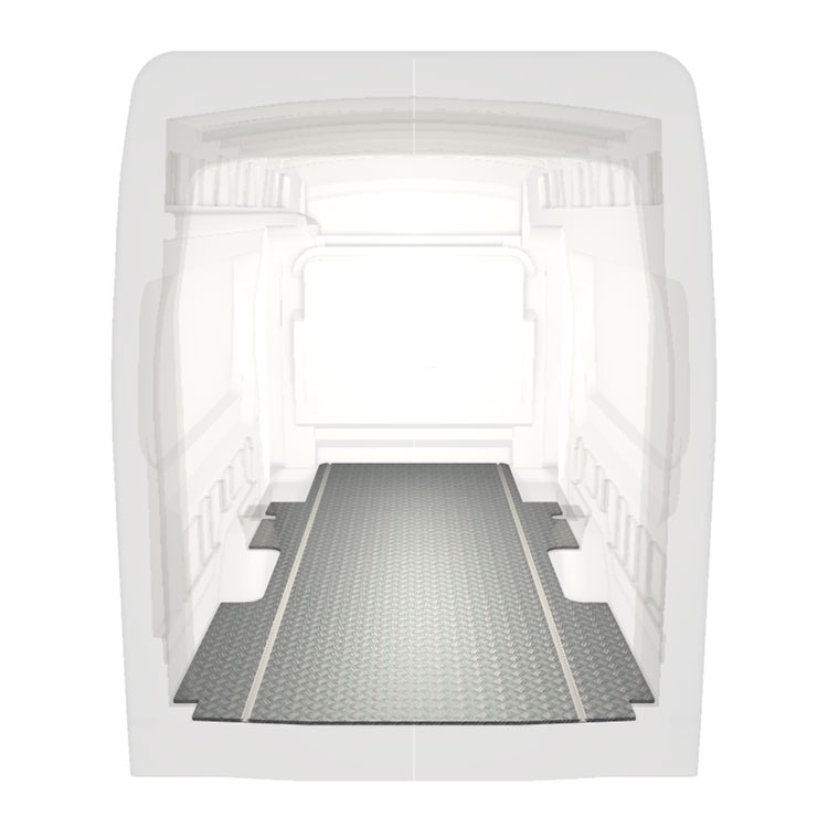 Leichte und robuste, extra lange Böden für einen Ford Transit werden mit einem rutschfesten Trittblech aus Aluminium und Schienen (längs) für eine schnelle und sichere Montage von Regalsystemen und anderem Zubehör geliefert.
