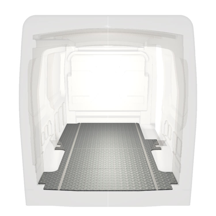 Leichte und robuste Standard-Fahrzeugböden für einen Ford Transit werden mit einem rutschfesten Trittblech aus Aluminium und Schienen (längs) für eine schnelle und sichere Montage von Regalsystemen und anderem Zubehör geliefert.