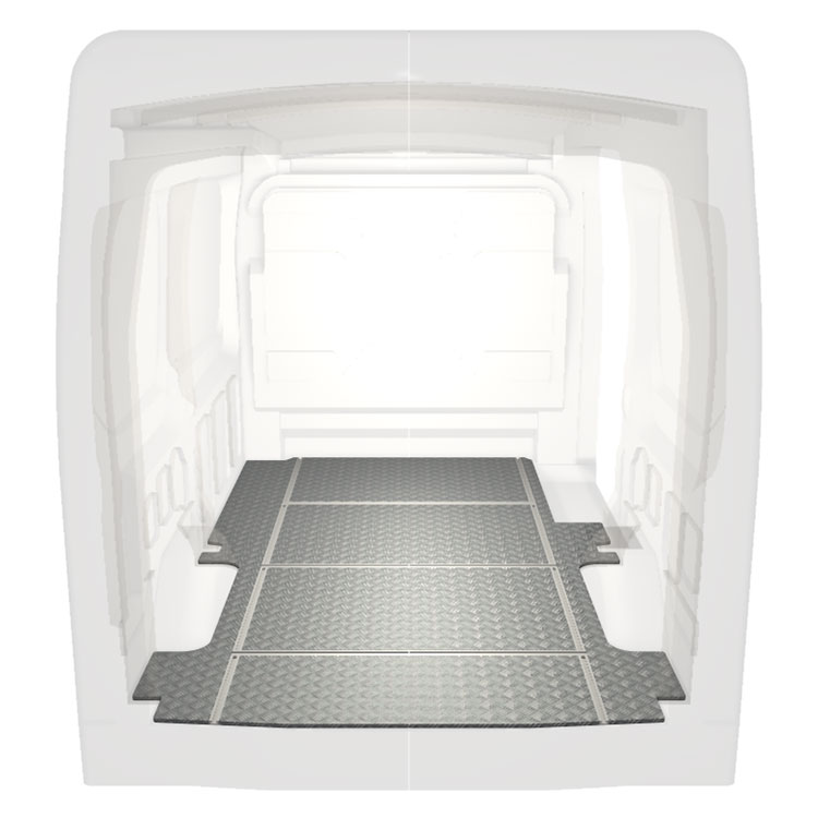 Leichte und robuste Fahrzeugböden mit Querschienen für einen Ford Transit werden mit einem rutschfesten Trittblech aus Aluminium und Schienen (längs und quer) für eine schnelle und sichere Montage von Regalsystemen und anderem Zubehör geliefert.