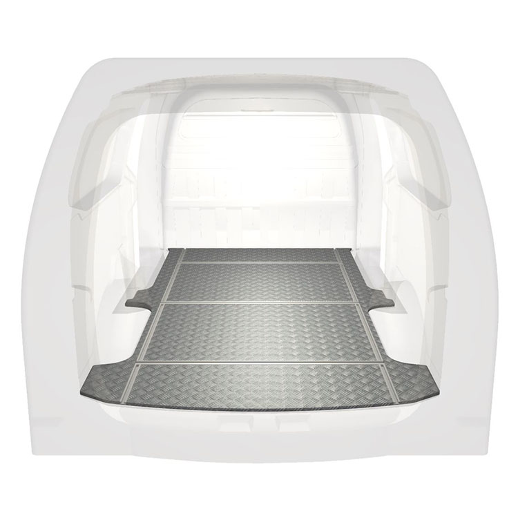 Leichte und robuste Fahrzeugböden mit Querschienen für einen Hyundai H1 werden mit einem rutschfesten Trittblech aus Aluminium und Schienen (längs und quer) für eine schnelle und sichere Montage von Regalsystemen und anderem Zubehör geliefert.
