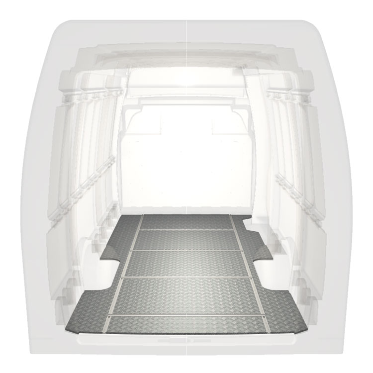 Leichte und robuste Fahrzeugböden mit Querschienen für einen Iveco Daily werden mit einem rutschfesten Trittblech aus Aluminium und Schienen (längs und quer) für eine schnelle und sichere Montage von Regalsystemen und anderem Zubehör geliefert.