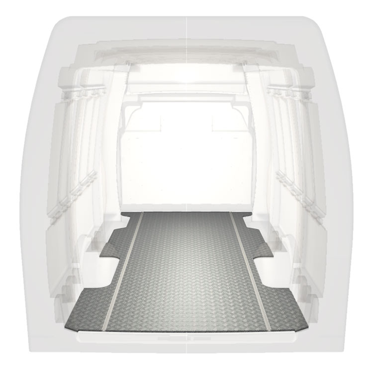 Leichte und robuste, extra lange Böden für einen Iveco Daily werden mit einem rutschfesten Trittblech aus Aluminium und Schienen (längs) für eine schnelle und sichere Montage von Regalsystemen und anderem Zubehör geliefert.