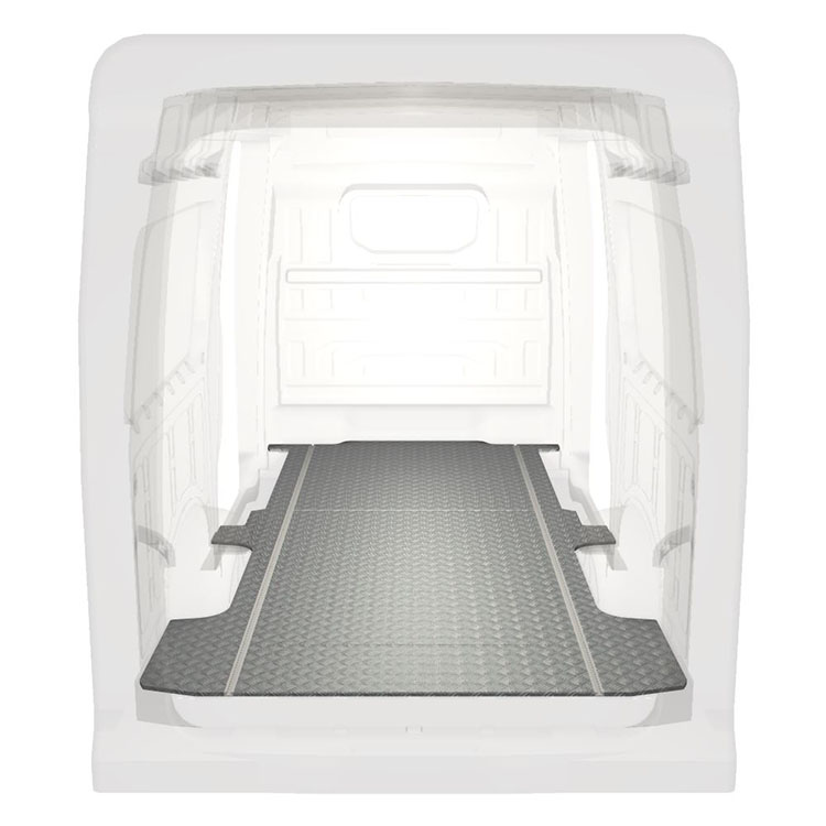 Leichte und robuste Standard-Fahrzeugböden für einen Volkswagen Crafter / MAN TGE werden mit einem rutschfesten Trittblech aus Aluminium und Schienen (längs) für eine schnelle und sichere Montage von Regalsystemen und anderem Zubehör geliefert.