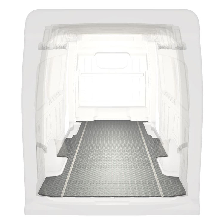 Leichte und robuste Standard-Fahrzeugböden für einen Volkswagen Crafter / MAN TGE werden mit einem rutschfesten Trittblech aus Aluminium und Schienen (längs) für eine schnelle und sichere Montage von Regalsystemen und anderem Zubehör geliefert.