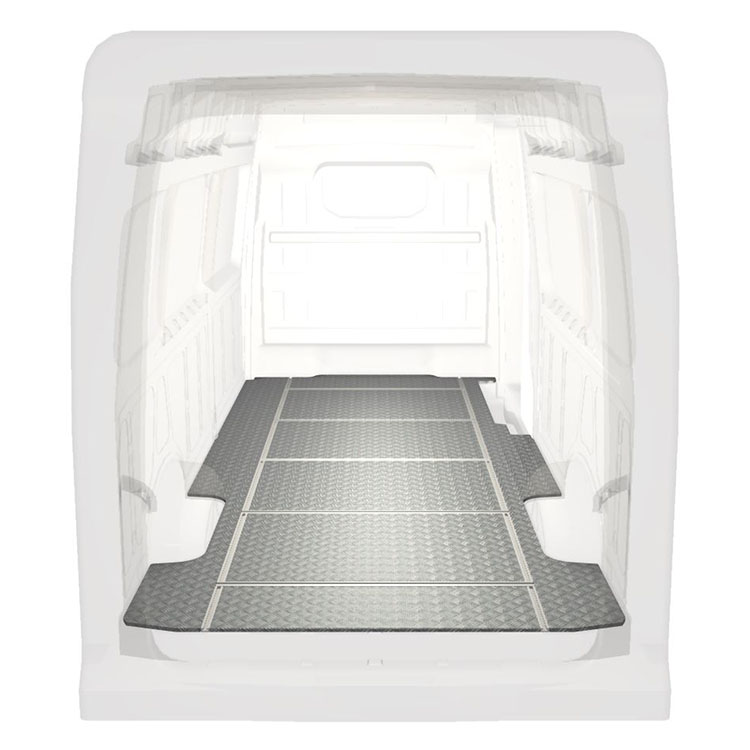 Leichte und robuste Fahrzeugböden mit Querschienen für einen Volkswagen Crafter / MAN TGE werden mit einem rutschfesten Trittblech aus Aluminium und Schienen (längs und quer) für eine schnelle und sichere Montage von Regalsystemen und anderem Zubehör geliefert.