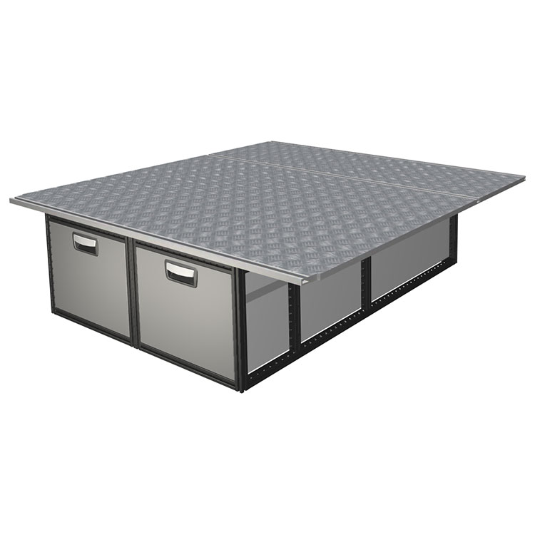 The kit is designed to be fitted on top of a Modul-Floor, utilizing the floor rails for a non-intrusive installation. The double floor is equipped with rails for easy installation of vehicle racking, and edging strips for a nice finish.