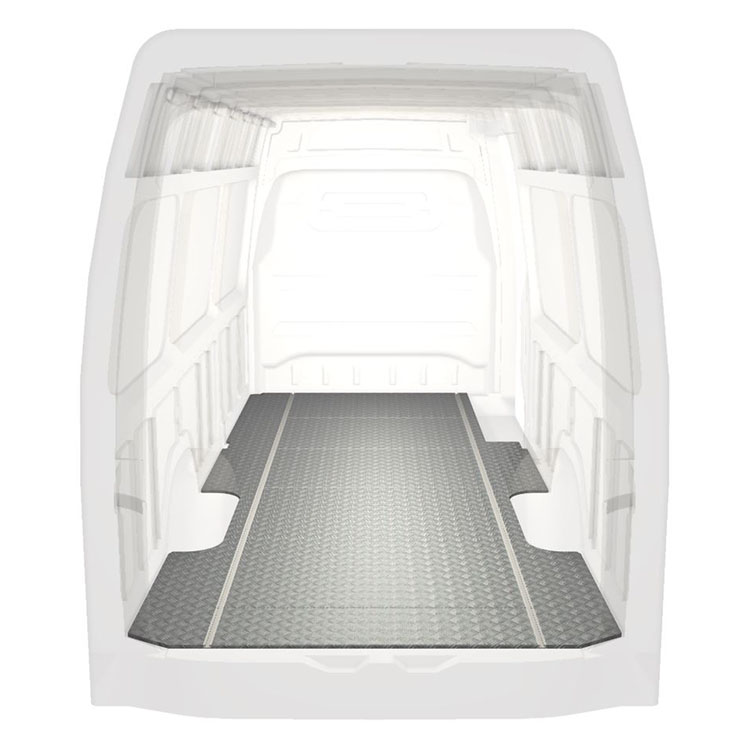 Leichte und robuste Standard-Fahrzeugböden für einen Mercedes Sprinter werden mit einem rutschfesten Trittblech aus Aluminium und Schienen (längs) für eine schnelle und sichere Montage von Regalsystemen und anderem Zubehör geliefert.