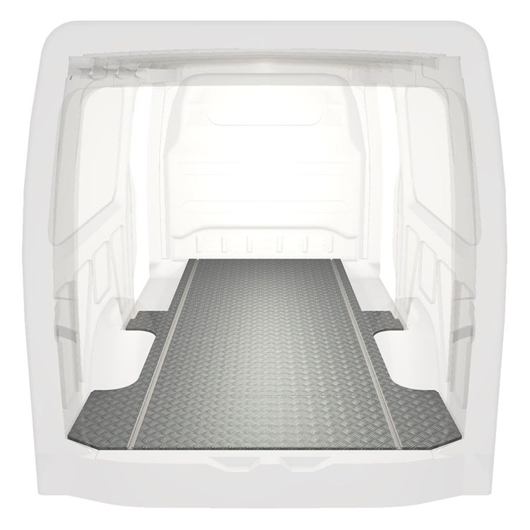 Leichte und robuste Standard-Fahrzeugböden für einen Mercedes Sprinter werden mit einem rutschfesten Trittblech aus Aluminium und Schienen (längs) für eine schnelle und sichere Montage von Regalsystemen und anderem Zubehör geliefert.