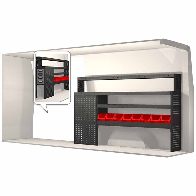 Dieses Einrichtungssystem wurde entworfen, um optimale Passgenauigkeit und bestmögliche Funktionalität und Sicherheit zu gewährleisten. Es ist für den professionellen Gebrauch entwickelt worden, ist flexibel und zur Anwendung in verschiedenen Geschäftsbereichen bestimmt. Universal- und Bodenwinkel sind enthalten.