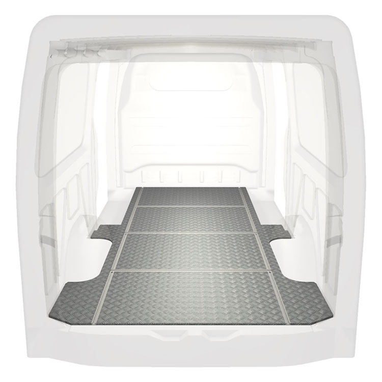Leichte und robuste Fahrzeugböden mit Querschienen für einen Mercedes Sprinter werden mit einem rutschfesten Trittblech aus Aluminium und Schienen (längs und quer) für eine schnelle und sichere Montage von Regalsystemen und anderem Zubehör geliefert.