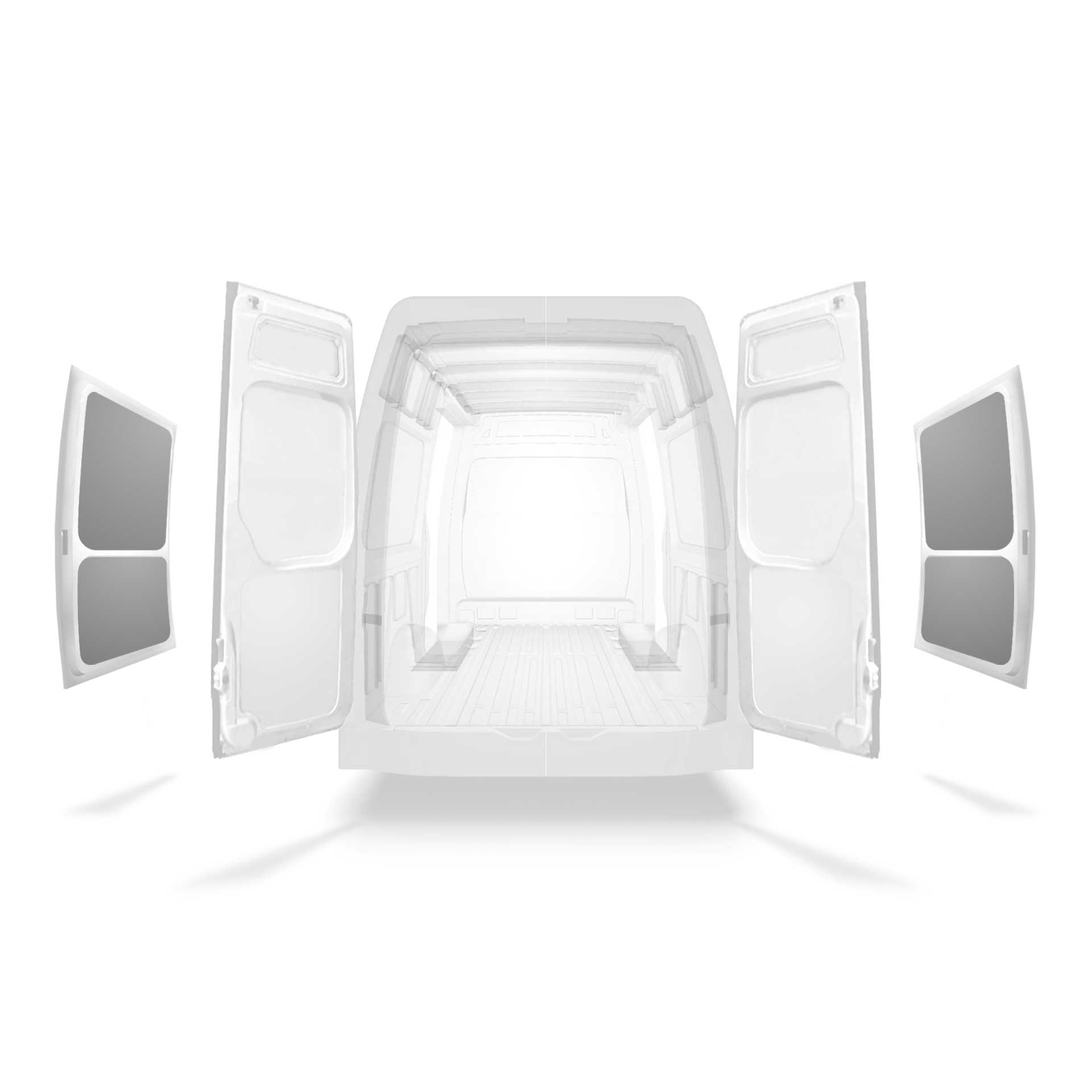 Die leichte Seitentür-Innenverkleidung eignet sich für einen Mercedes Sprinter mit zwei Seitentüren. Alle für die Verkleidung verwendeten Materialien sind leicht zu reinigen und schaffen eine helle Arbeitsumgebung.