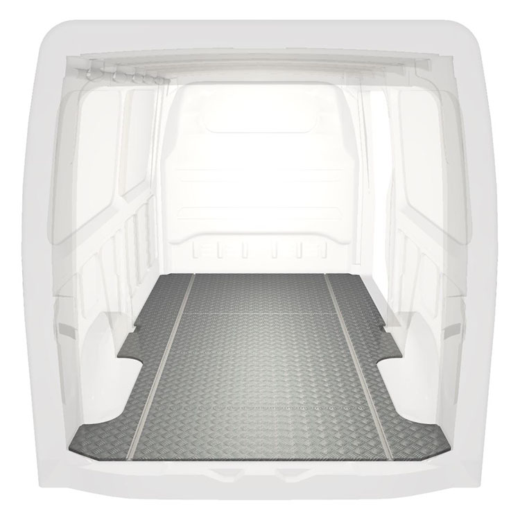 Leichte und robuste Standard-Fahrzeugböden für einen Mercedes Sprinter werden mit einem rutschfesten Trittblech aus Aluminium und Schienen (längs) für eine schnelle und sichere Montage von Regalsystemen und anderem Zubehör geliefert.