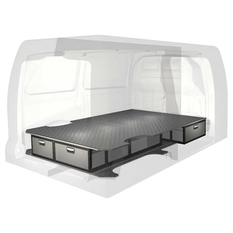 The kit is designed to be fitted on top of a Modul-Floor, utilizing the floor rails for a non-intrusive installation. The double floor is equipped with rails for easy installation of vehicle racking, and edging strips for a nice finish.