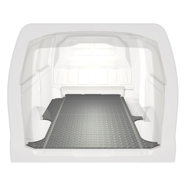Leichte und robuste Standard-Fahrzeugböden für einen Mercedes Vito werden mit einem rutschfesten Trittblech aus Aluminium und Schienen (längs) für eine schnelle und sichere Montage von Regalsystemen und anderem Zubehör geliefert.