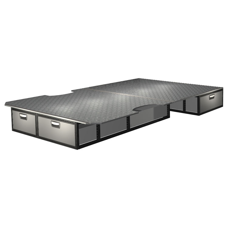 The kit is designed to be fitted on top of a wooden floor. The double floor is equipped with rails for easy installation of vehicle racking, and edging strips for a nice finish.